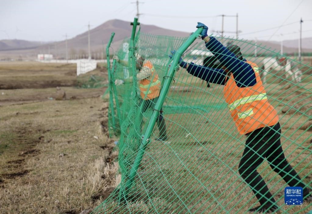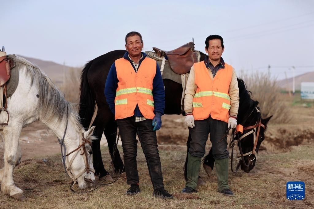 5月2日,河北省承德市豐寧滿族自治縣大灘鎮(zhèn)扎拉營村的護林員趙世海(右)和羅金寶在海留圖國家濕地公園修復護欄。
