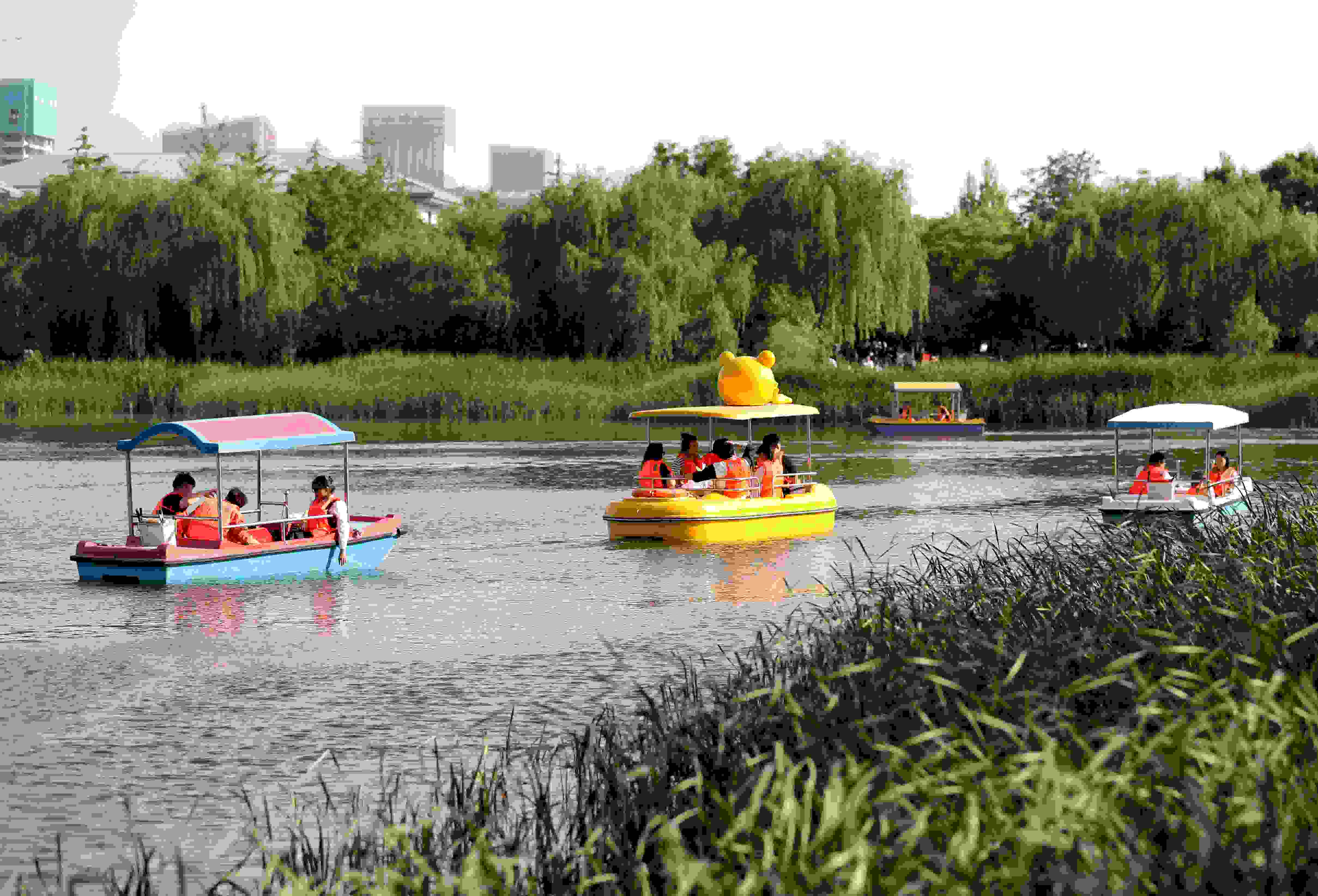 5月2日,游人在山東淄博齊盛湖里泛舟游玩。