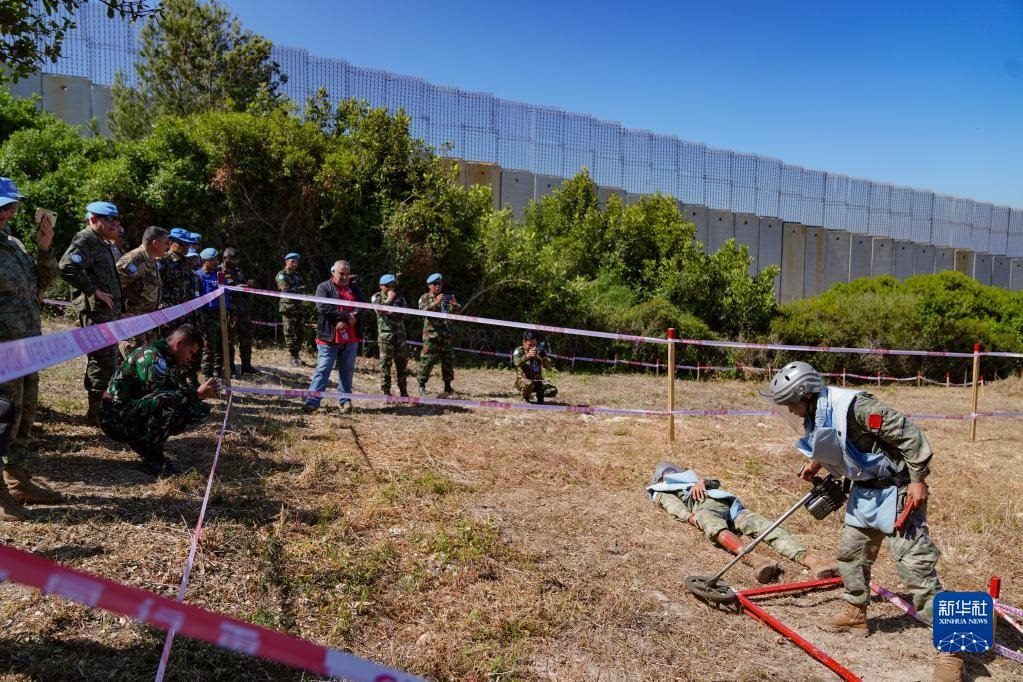 5月3日,在黎巴嫩南部邊境“藍(lán)線”附近雷場(chǎng),參與演習(xí)的中國(guó)第21批赴黎巴嫩維和多功能工兵分隊(duì)掃雷作業(yè)手開(kāi)辟救援通道。