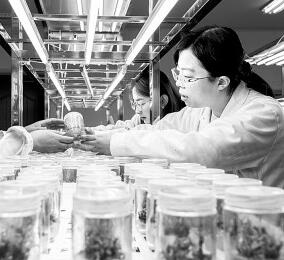 3月29日,在內(nèi)蒙古林業(yè)科學(xué)研究院承擔(dān)的“沙地生物資源保護(hù)與培育國家林業(yè)和草原局重點(diǎn)實(shí)驗室”,科研人員在觀察黑果枸杞組培苗的培養(yǎng)狀態(tài)。丁根厚攝/光明圖片