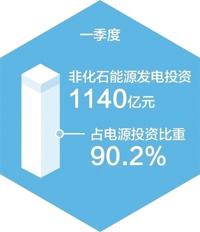 非化石能源發(fā)電投資較快增長。一季度,全國主要發(fā)電企業(yè)電源工程完成投資1264億元,同比增長55.2%,其中非化石能源發(fā)電投資1140億元,同比增長62.8%,占電源投資的比重達(dá)到90.2%。具體看,太陽能發(fā)電、核電、風(fēng)電投資同比分別增長177.6%、53.5%、15%。