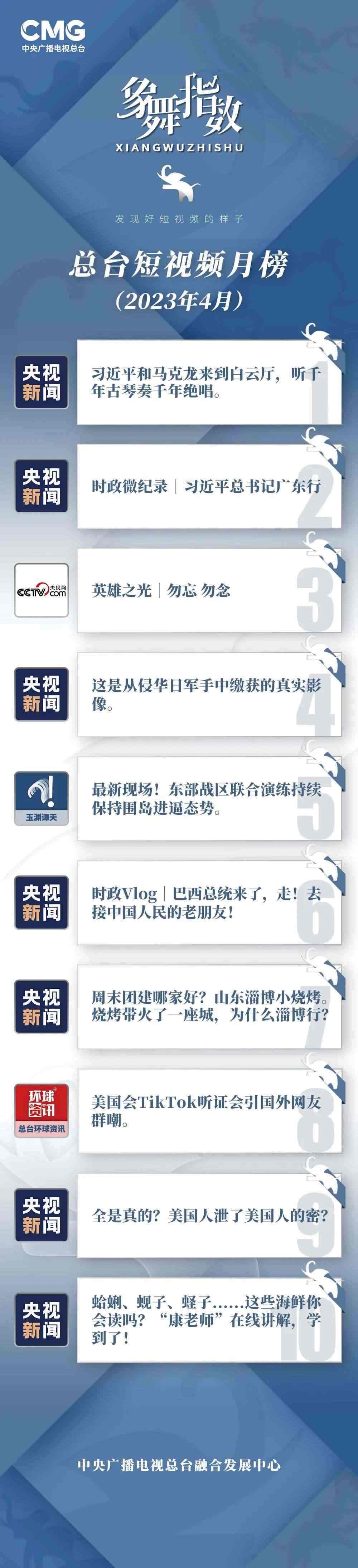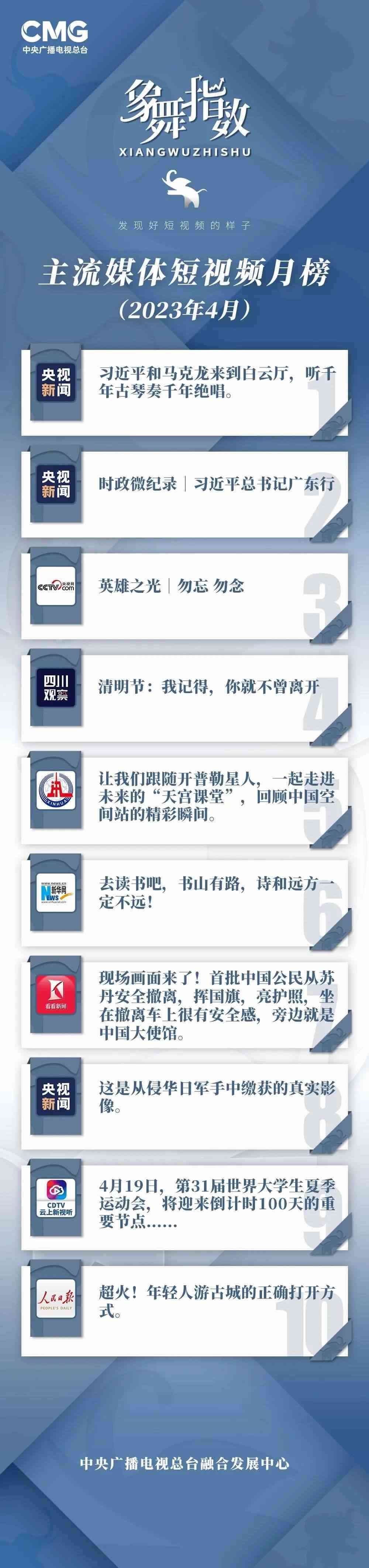 中央廣播電視總臺(tái)“象舞指數(shù)”評議品牌,推出主流媒體短視頻月榜、總臺(tái)短視頻月榜。在2023年4月,這些內(nèi)容引發(fā)大眾關(guān)注: