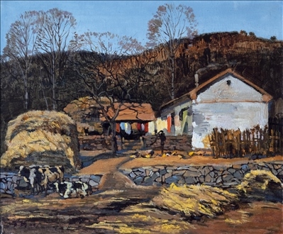 《激戰(zhàn)松骨峰》描繪的是抗美援朝戰(zhàn)爭(zhēng)中,中國(guó)人民志愿軍與美軍激烈廝殺的悲壯場(chǎng)面。作者從動(dòng)態(tài)型的構(gòu)圖與形象表層,把戰(zhàn)爭(zhēng)集團(tuán)之間的搏殺以濃重的筆調(diào)展現(xiàn)開(kāi)來(lái),表現(xiàn)了中國(guó)人民志愿軍英勇頑強(qiáng)、熱愛(ài)自由和勇于犧牲的精神,展示了歷史的悲劇性沖突。作者從沉甸甸的歷史中找到戰(zhàn)爭(zhēng)中最慘烈、最殘酷、最能表現(xiàn)人物悲劇性命運(yùn)的瞬間,用現(xiàn)實(shí)主義的創(chuàng)作手法,扎實(shí)、生動(dòng)地塑造了一個(gè)又一個(gè)志愿軍勇士的形象。硝煙籠罩著戰(zhàn)場(chǎng),鮮血與白雪融合成冰,敵我雙方,犬牙交錯(cuò),生死搏殺。同時(shí),也使我們感受到戰(zhàn)爭(zhēng)的殘酷與生命的脆弱。作者處理宏大的戰(zhàn)爭(zhēng)場(chǎng)面獨(dú)具匠心:陽(yáng)光透過(guò)硝煙,有節(jié)奏地營(yíng)造出戰(zhàn)場(chǎng)的空間;雪地上被間隔的藍(lán)色陰影,反襯出黃褐色的主調(diào)。作品對(duì)細(xì)部進(jìn)行了恰如其分的刻畫(huà),但又不失對(duì)整體宏觀的把握,厚重的色彩中透出熱情,樸拙的筆觸映著畫(huà)家的激動(dòng)。