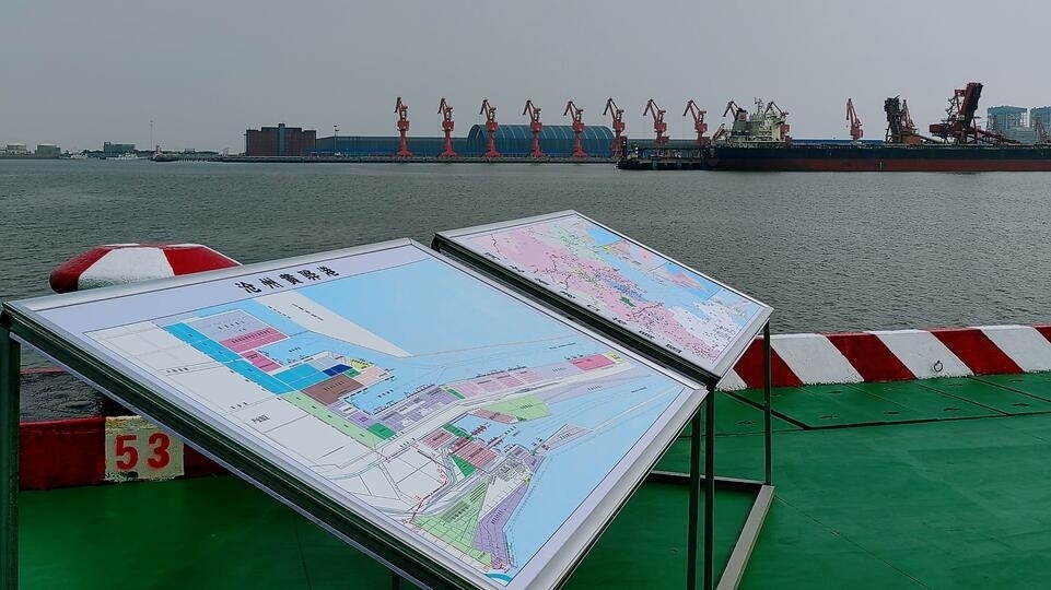 △位于渤海灣穹頂處的滄州黃驊港。(總臺央視記者張曉鵬拍攝)