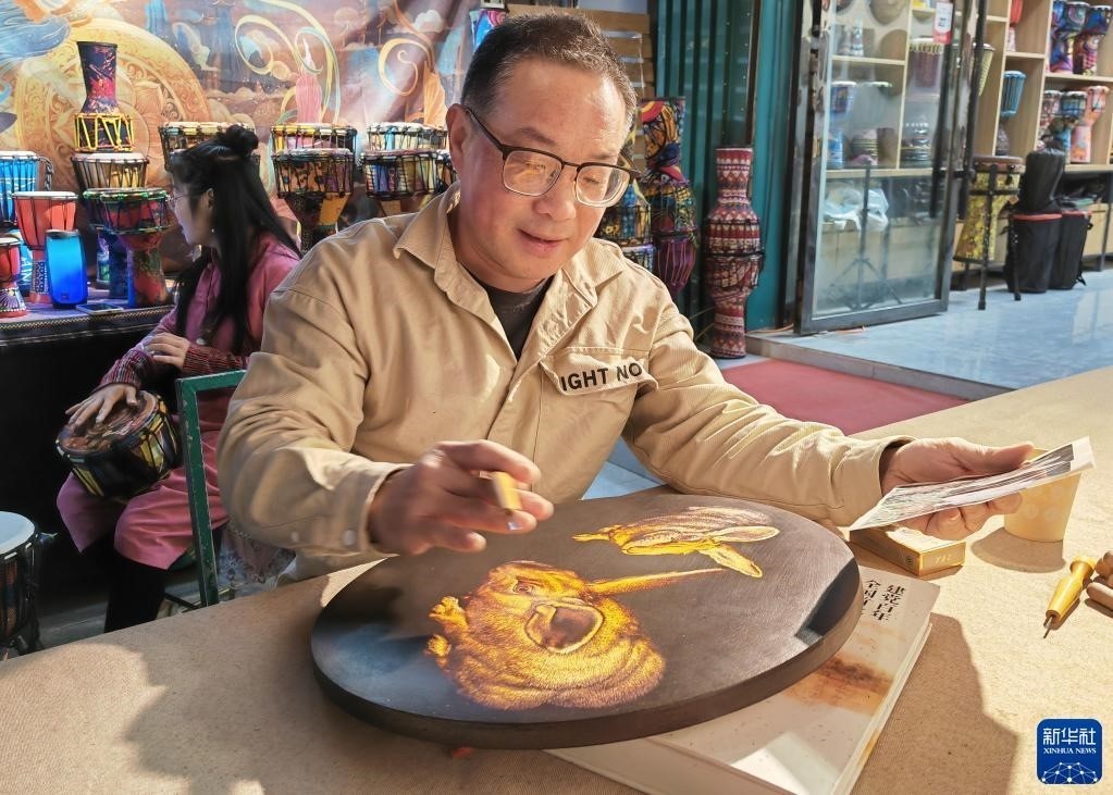 5月10日,工藝美術(shù)師申洪杰在敦煌夜市進(jìn)行敦煌木刻畫創(chuàng)作展示(手機(jī)照片)。