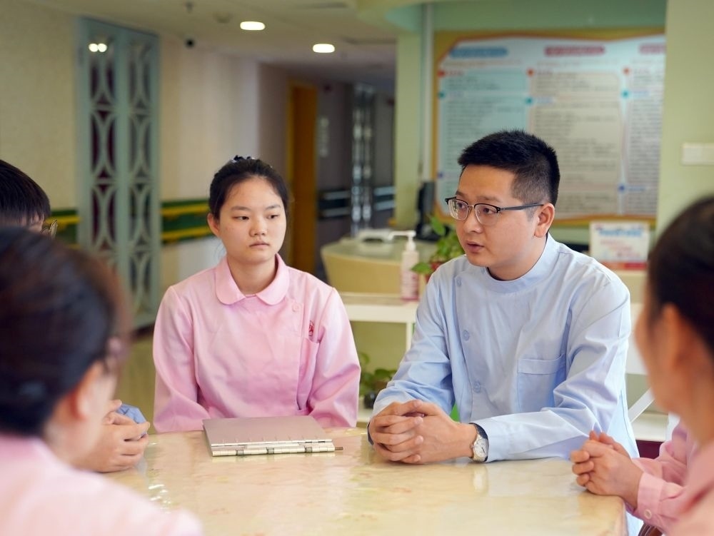 在上海市楊浦區(qū)社會福利院,護理主管王程(右)在護理員例會上點評發(fā)言(4月28日攝)。新華社記者 劉穎 攝