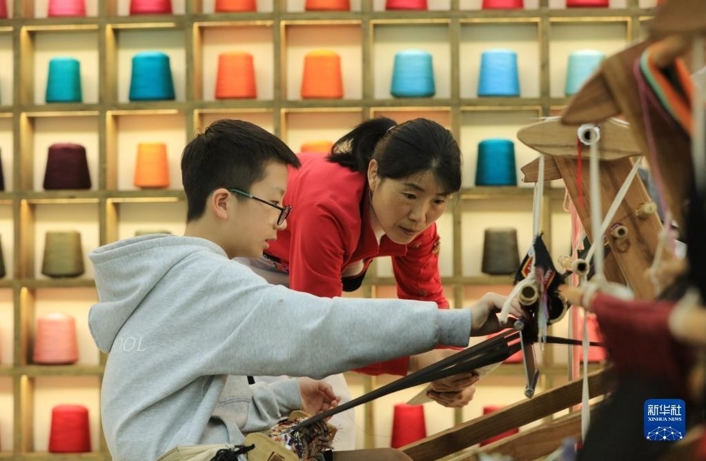 5月12日,來自上海包玉剛實驗學校的學生在張家界市武陵源區(qū)乖幺妹土家族織錦基地學習體驗土家族織錦非遺技藝。