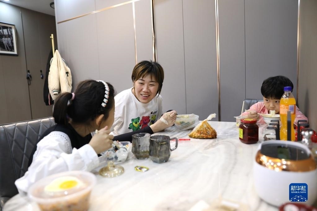 5月11日,韓丹和孩子在家里一邊吃飯,一邊交流。   新華社記者 姚劍鋒 攝
