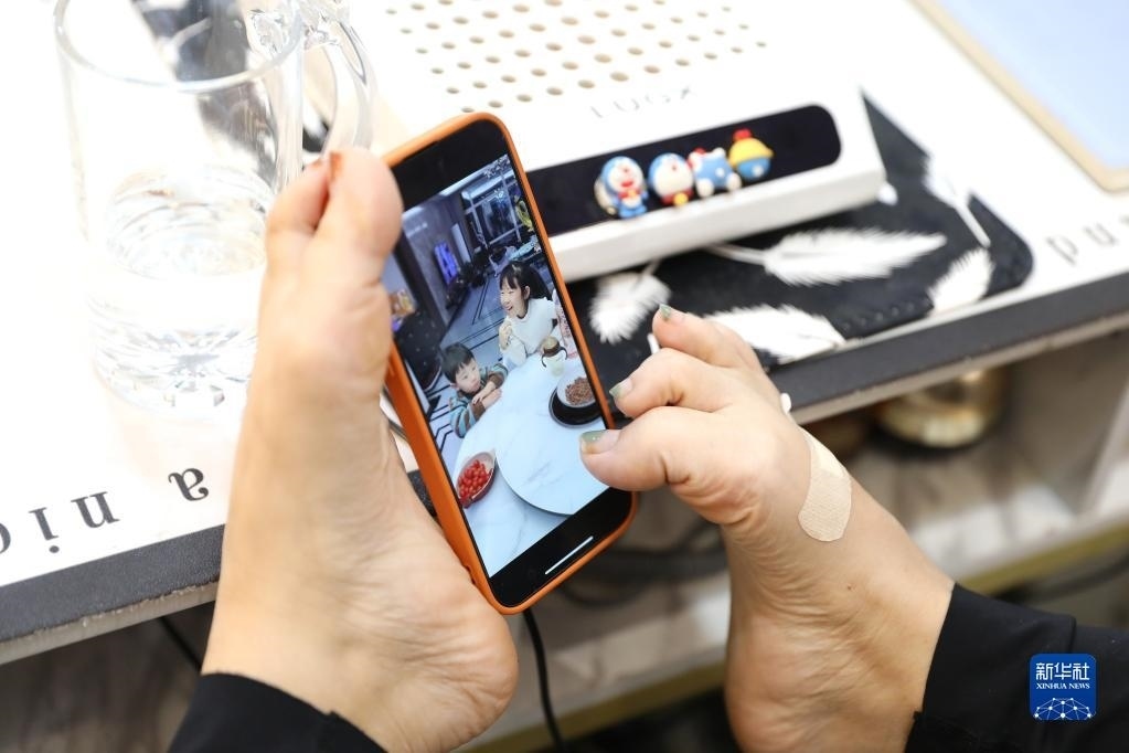 5月11日,韓丹翻看著手機里兩個孩子的視頻。   新華社記者 姚劍鋒 攝
