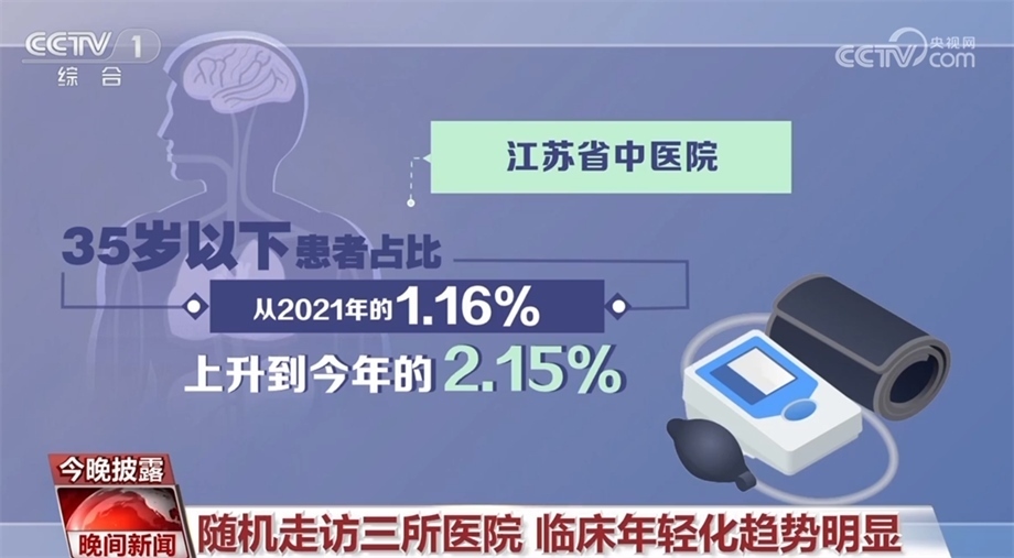 總臺(tái)記者隨機(jī)走訪了北京、江蘇、河南三所醫(yī)院的高血壓門診發(fā)現(xiàn):河南省洛陽(yáng)市第一人民醫(yī)院,2022年接診的3000多名患者中,低于30歲的有21人;江蘇省中醫(yī)院,35歲以下患者占比從2021年的1.16%,上升到今年的2.15%;北京安貞醫(yī)院的數(shù)據(jù)則顯示,70%的門診患者為中青年群體。