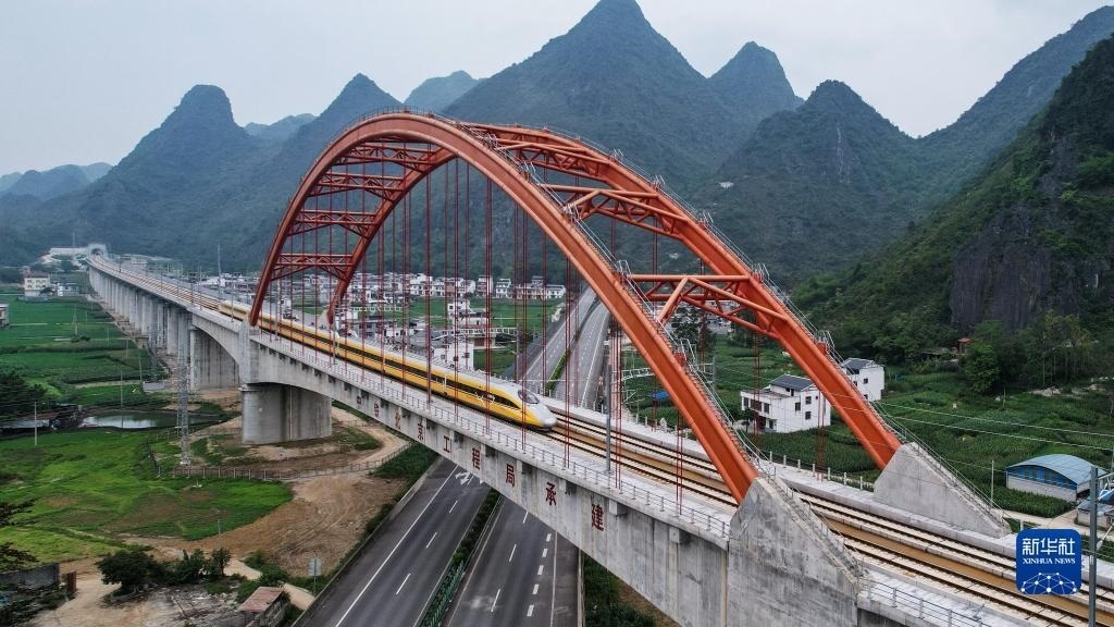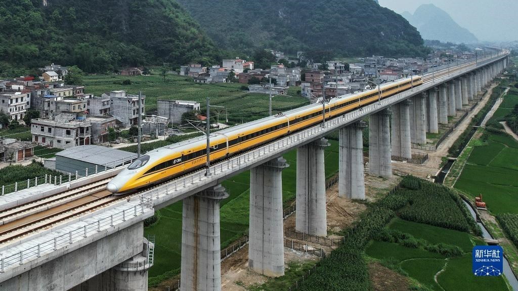 5月16日,高速綜合檢測(cè)列車(chē)行駛在貴南高鐵上進(jìn)行檢測(cè)工作(無(wú)人機(jī)照片)。   新華社記者 張愛(ài)林 攝