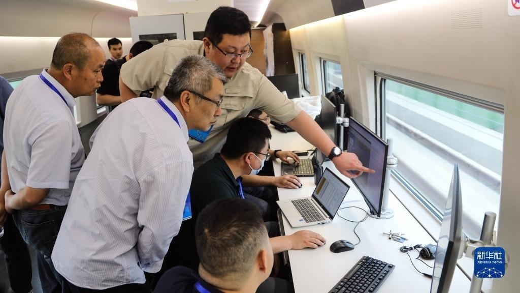 5月16日,在高速綜合檢測(cè)列車(chē)上,聯(lián)調(diào)聯(lián)試工作人員在分析測(cè)試數(shù)據(jù)。   新華社記者 張愛(ài)林 攝