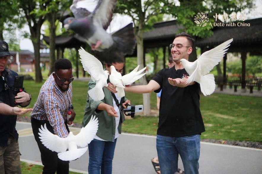 中國(guó)有約采訪團(tuán)成員喂食白鴿