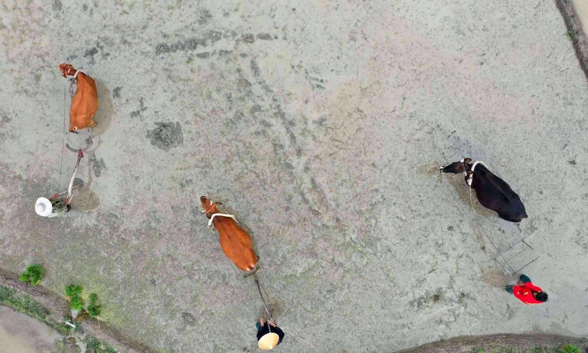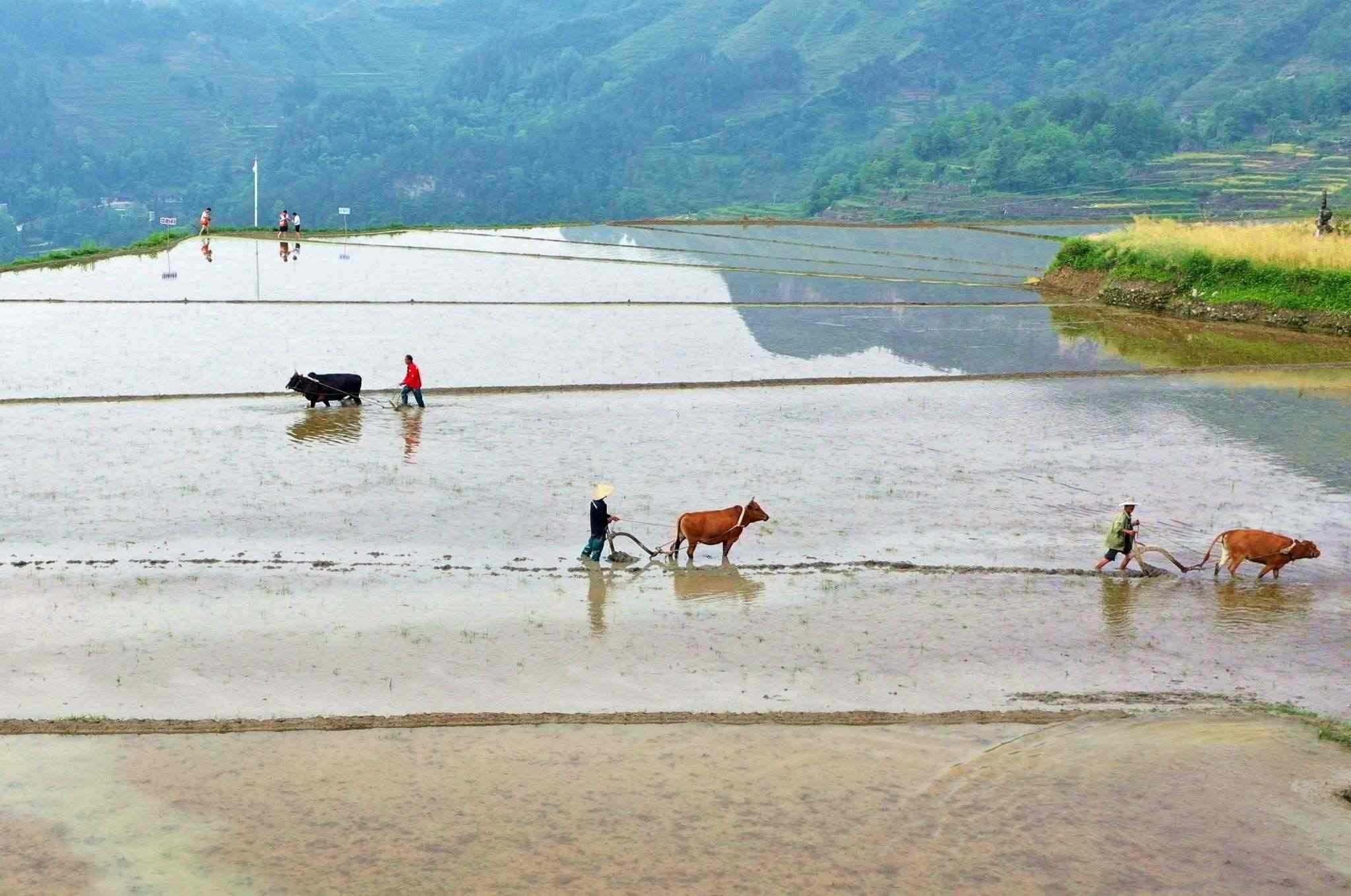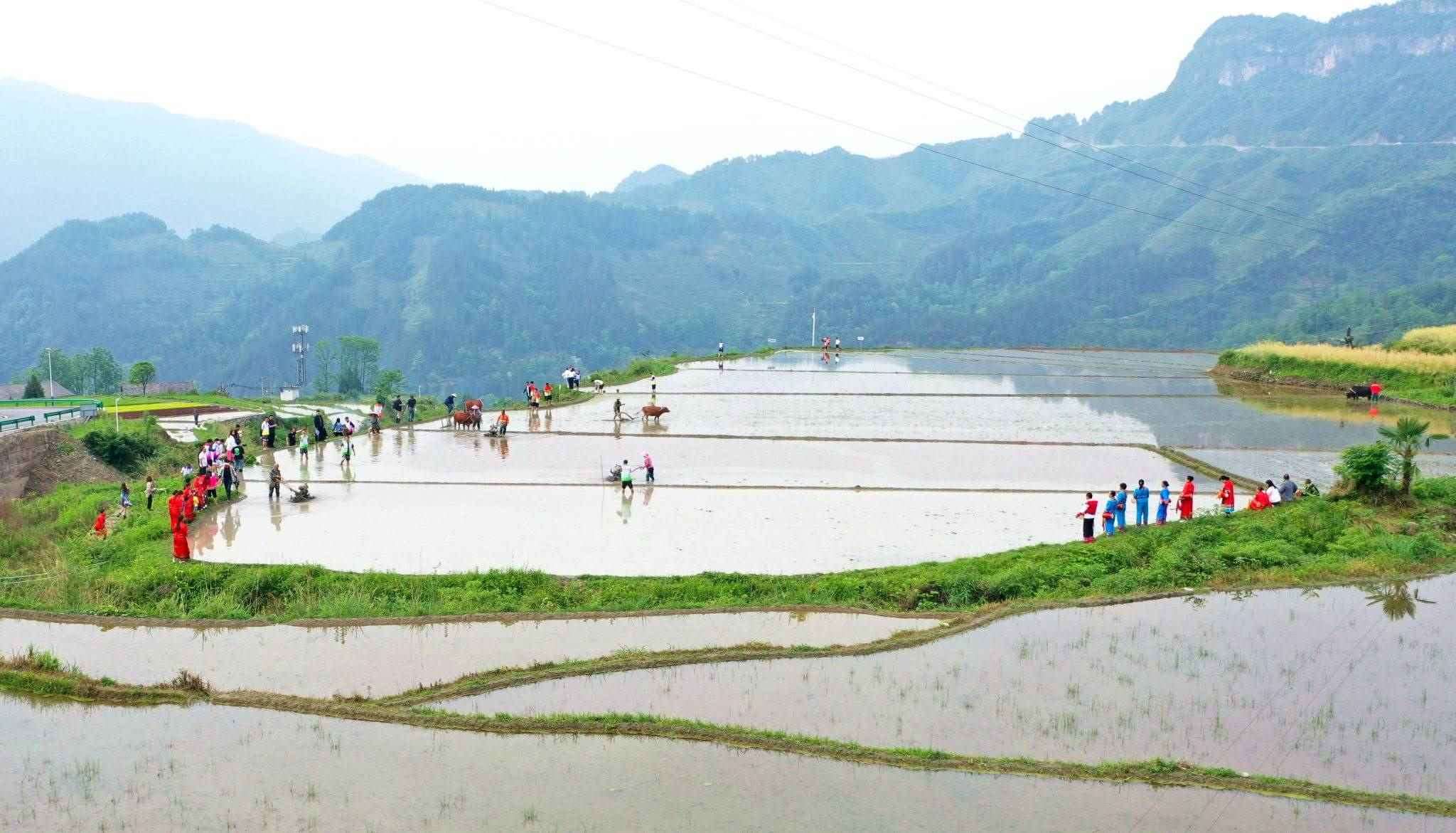 2023年5月19日,重慶,酉陽縣花田鄉(xiāng)何家?guī)r村的梯田里,村民們正在進行犁田插秧比賽,向游客展示農(nóng)耕文化魅力。視覺中國