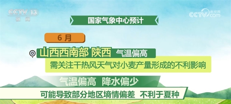 6月,西北、華北和黃淮冬麥區(qū)大部氣溫接近常年同期或偏高,大部地區(qū)降水接近常年或偏少,氣象條件總體利于冬小麥?zhǔn)斋@晾曬;但山西西南部、陜西氣溫偏高,需關(guān)注干熱風(fēng)天氣對(duì)小麥產(chǎn)量形成的不利影響,此外,氣溫偏高、降水偏少可能導(dǎo)致部分地區(qū)墑情偏差,不利于夏種。