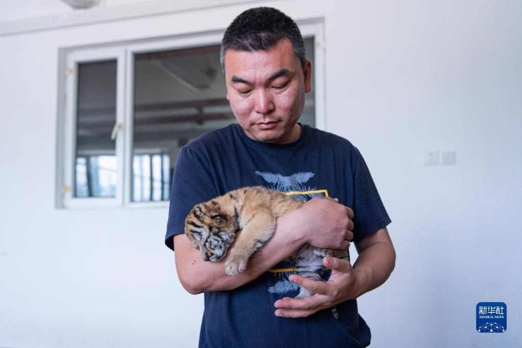 5月22日,在黑龍江東北虎林園的虎舍中,飼養(yǎng)員查看東北虎幼崽生長狀況。   新華社記者 謝劍飛 攝