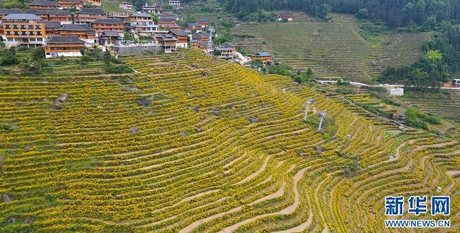 5月,在廣西桂林市龍勝縣泗水鄉(xiāng),近千畝連綿一片的布尼梯田已花開(kāi)成海,絢麗多彩的花海梯田吸引游客前來(lái)打卡拍照。 (伍春媛)