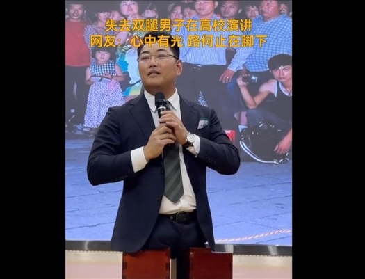 近日,山東臨沂,失去雙腿的男子在高校演講。據(jù)悉,該男子名叫陳州,是世界上第一個用雙手登頂五岳的人。網友:心中有光,路何止在腳下。