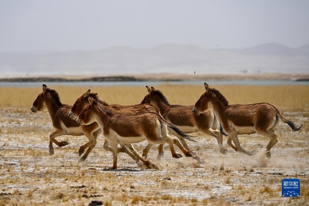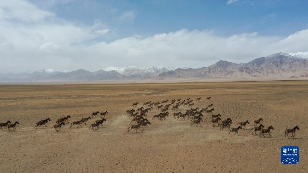 一群藏野驢在阿爾金山國(guó)家級(jí)自然保護(hù)區(qū)奔跑(5月23日攝)。