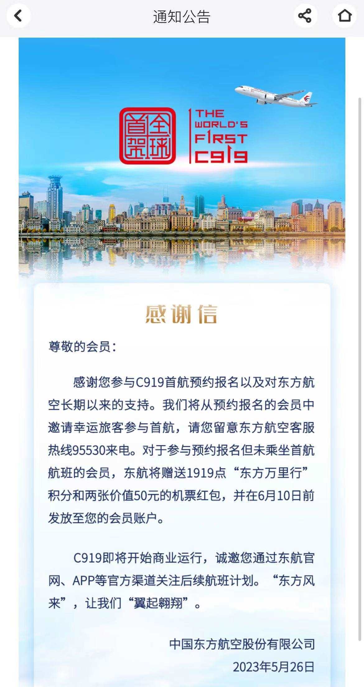 東航APP上還發(fā)布了一則感謝信,信中表示,C919即將開始商業(yè)運行,東航將從預約報名的會員中邀請幸運旅客參與首航,對于參與預約報名但未乘坐首航航班的會員,東航將贈送1919點“東方萬里行”積分和兩張價值50元的機票紅包,并在6月10日前發(fā)放至會員賬戶。