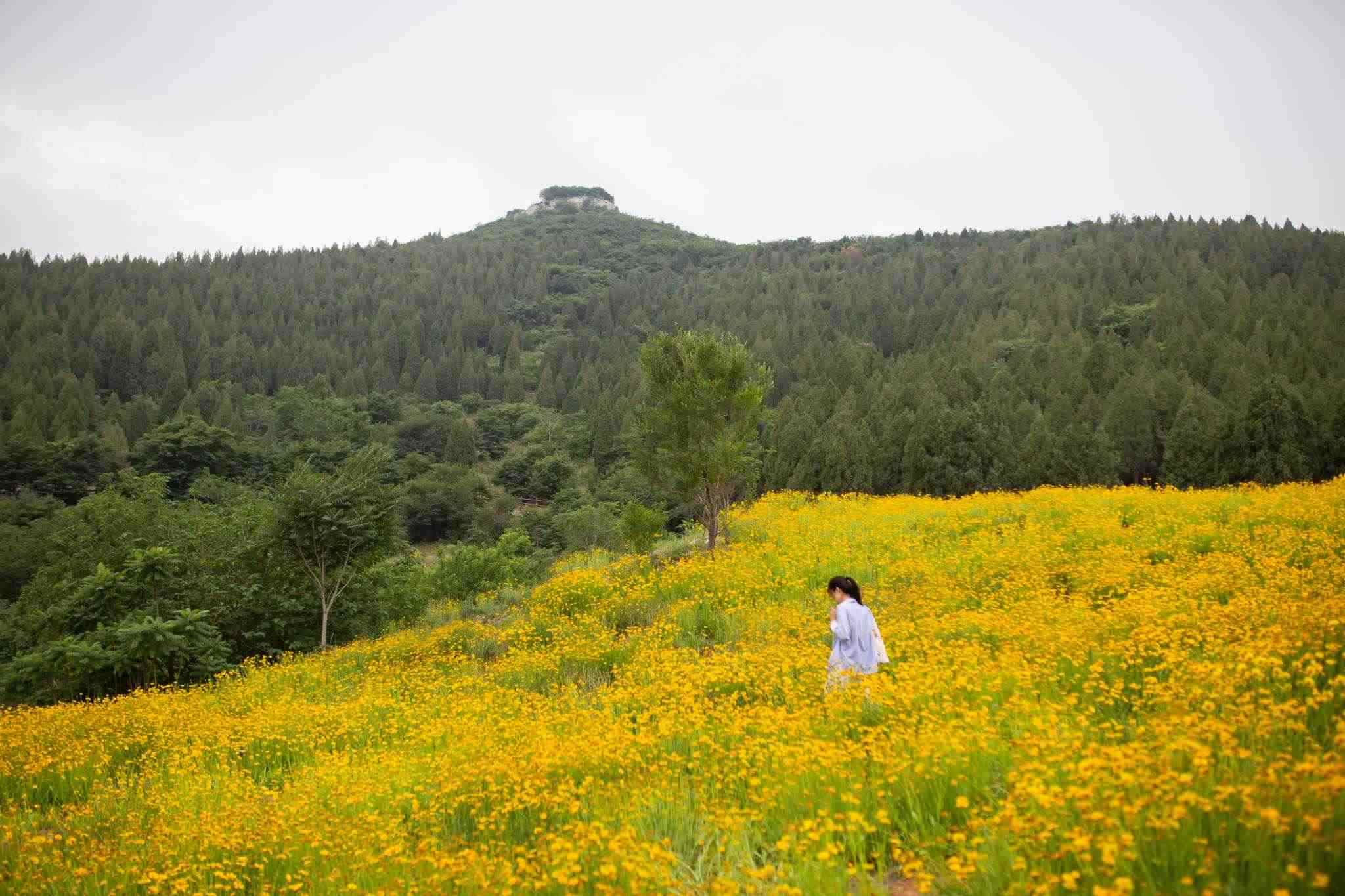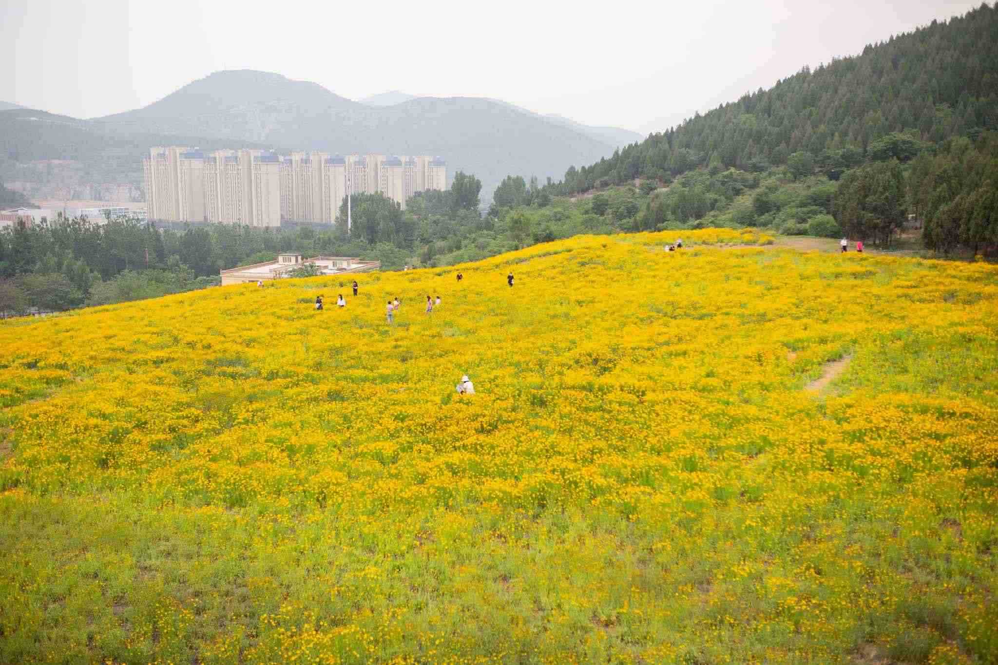 2023年5月26日,濟(jì)南蚰蜒山,山谷大片的金雞菊盛開,宛如一片黃色的花海。視覺中國(guó)