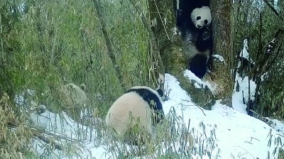 還有一段視頻顯示,白色大熊貓身上披著一層白雪,與它的毛色融為一體,雪落在眼睛上,宛若天然的白色睫毛。它拖著一根竹子到樹下,“咔哧咔哧”吃了起來。