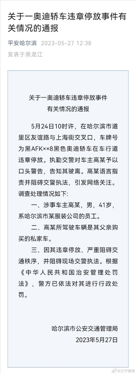 ·哈爾濱警方通報網(wǎng)傳副市長違停與交警沖突:涉事車主為服裝公司員工。