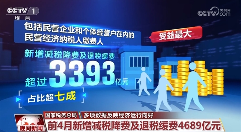 國家稅務(wù)總局?jǐn)?shù)據(jù)顯示,今年1—4月,全國新增減稅降費(fèi)及退稅緩費(fèi)4689億元。分經(jīng)濟(jì)類型看,包括民營企業(yè)和個(gè)體經(jīng)營戶在內(nèi)的民營經(jīng)濟(jì)納稅人繳費(fèi)人新增減稅降費(fèi)及退稅緩費(fèi)超過3393億元,占比超七成,受益最大。