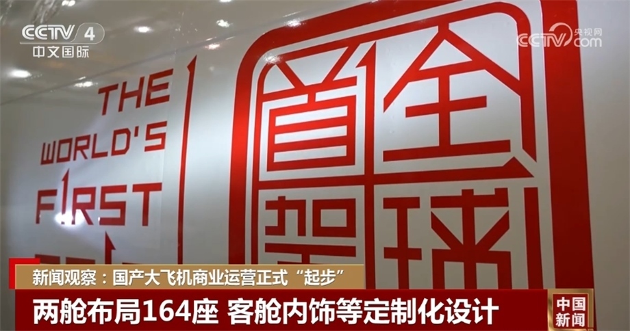 今天執(zhí)行商業(yè)首飛的C919飛機為164座兩艙布局,公務艙8座,經(jīng)濟艙156座。客艙內(nèi)飾、旅客座椅、機載娛樂系統(tǒng)和飛機外部涂裝做了定制化設(shè)計。機身前部印有“全球首架”的“中國印”標識和對應英文。飛機注冊號B-919A,“B”代表飛機的中國國籍,“919”和型號名稱契合,“A”則有首架之意,突顯這一全球新機型、全球首架的非凡意義。