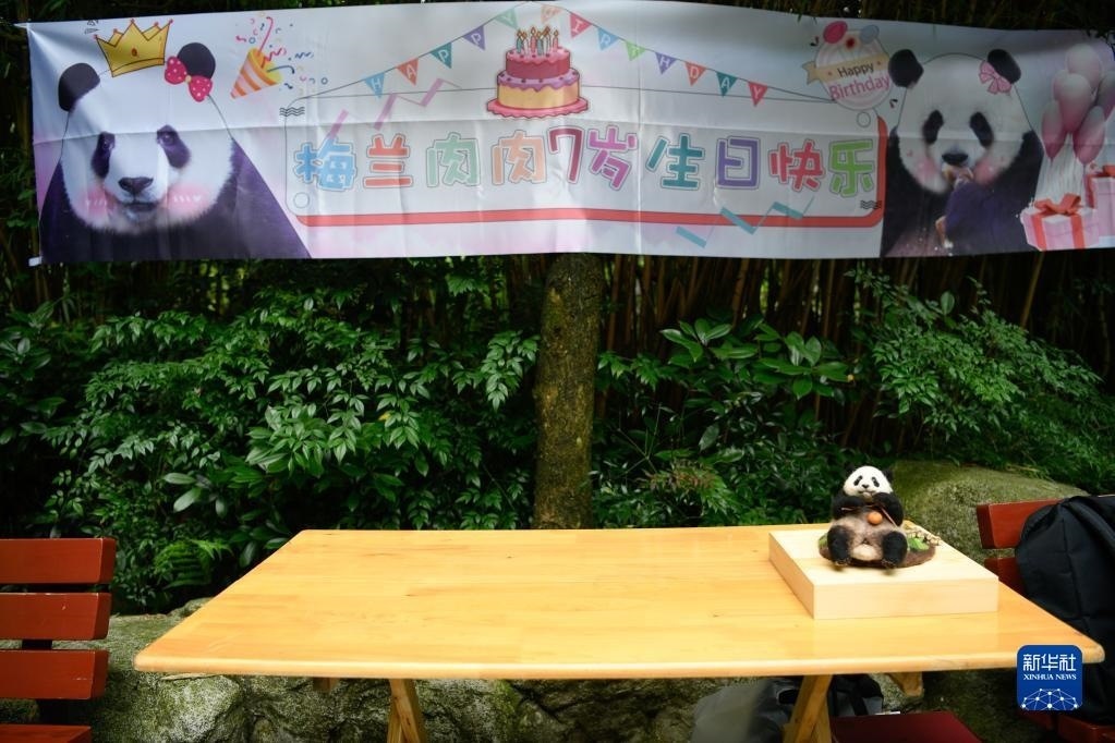 這是5月29日在成都大熊貓繁育研究基地都江堰野放繁育研究中心拍攝的市民為梅蘭布置的生日裝飾。   新華社記者 胥冰潔 攝