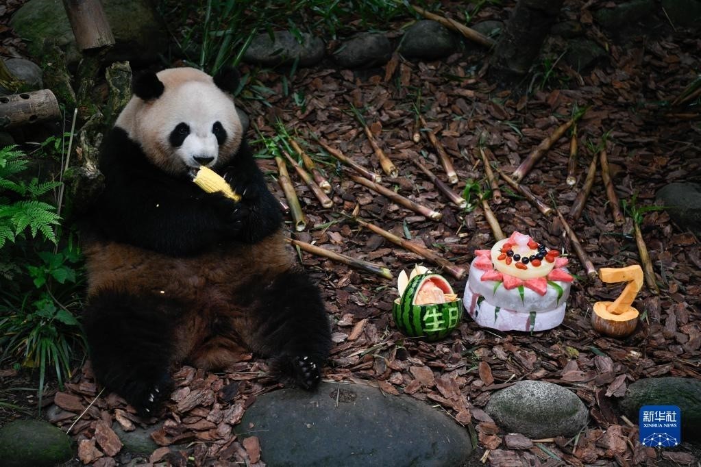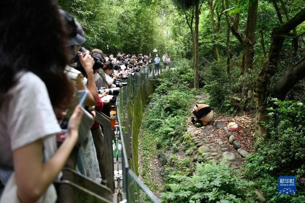 5月29日,市民在成都大熊貓繁育研究基地都江堰野放繁育研究中心為梅蘭慶祝生日。   新華社記者 胥冰潔 攝