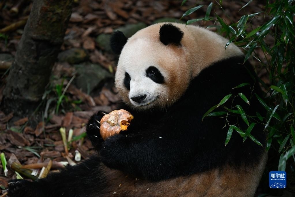 5月29日,在成都大熊貓繁育研究基地都江堰野放繁育研究中心,梅蘭在吃南瓜。   新華社記者 胥冰潔 攝