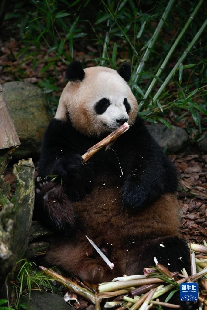 5月29日,在成都大熊貓繁育研究基地都江堰野放繁育研究中心,梅蘭在吃竹筍。   新華社記者 胥冰潔 攝