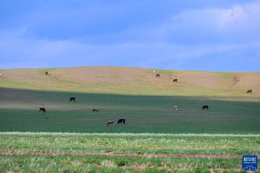 5月30日,牛群在內(nèi)蒙古錫林郭勒盟蘇尼特右旗境內(nèi)的草原上悠閑覓食。   新華社記者 彭源 攝