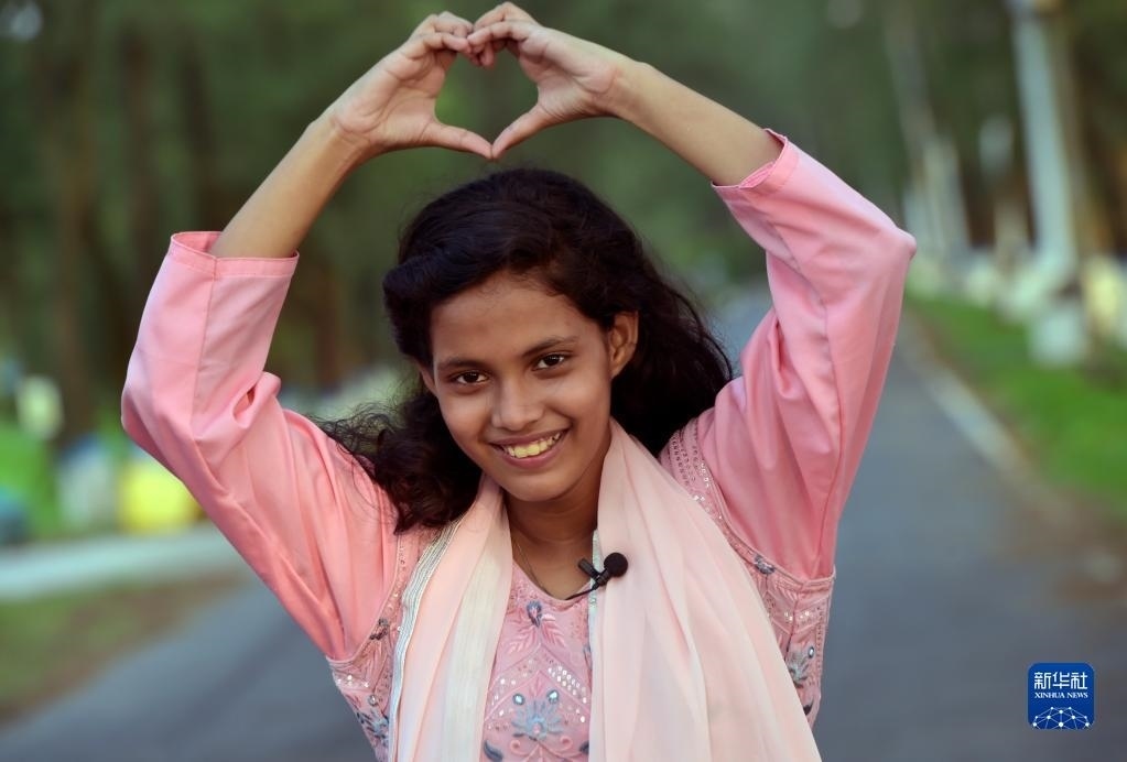 5月26日,在孟加拉國首都達(dá)卡,阿里法·沁做出愛心手勢表達(dá)對(duì)中國的愛意。新華社發(fā)