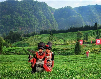 四川省小涼山地區(qū)的樂山市馬邊彝族自治縣福來村,身著傳統(tǒng)彝族服飾的工作人員用手機(jī)直播采茶(2022 年 4月 27 日攝)唐文豪攝 / 本刊