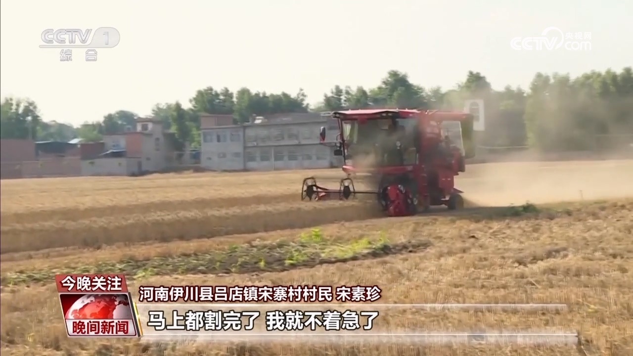 伊川縣呂店鎮(zhèn)宋寨村村民 宋素珍:前幾天下雨小麥?zhǔn)詹换貋?,心里可心慌,鄉(xiāng)里派履帶式收割機,我這十幾畝地馬上都挨?。ㄝ喌剑┝?,馬上都割完了,我就不著急了。