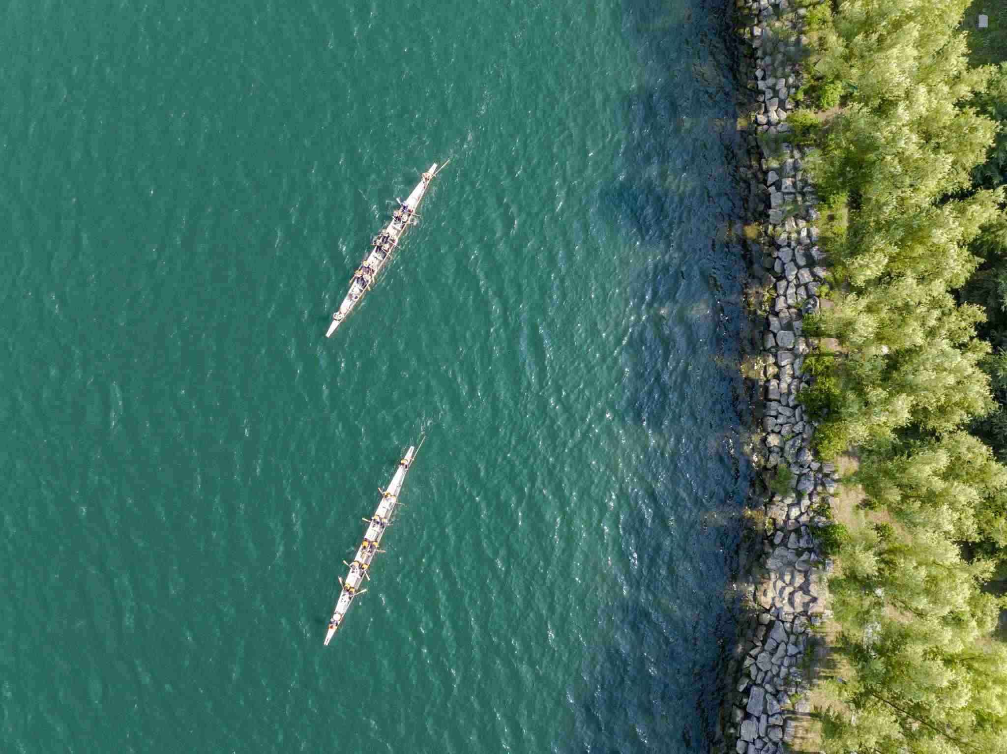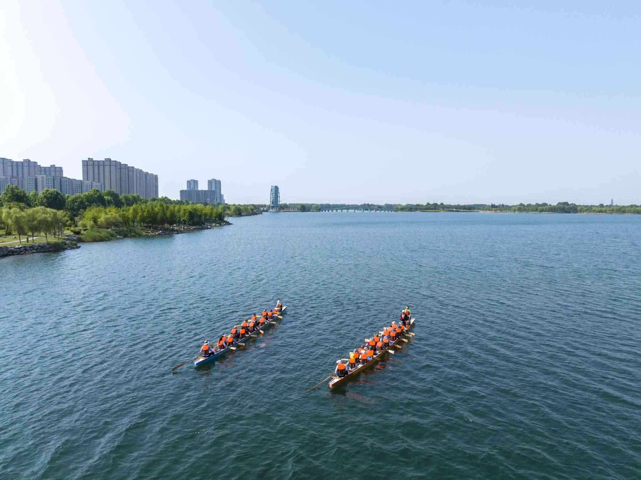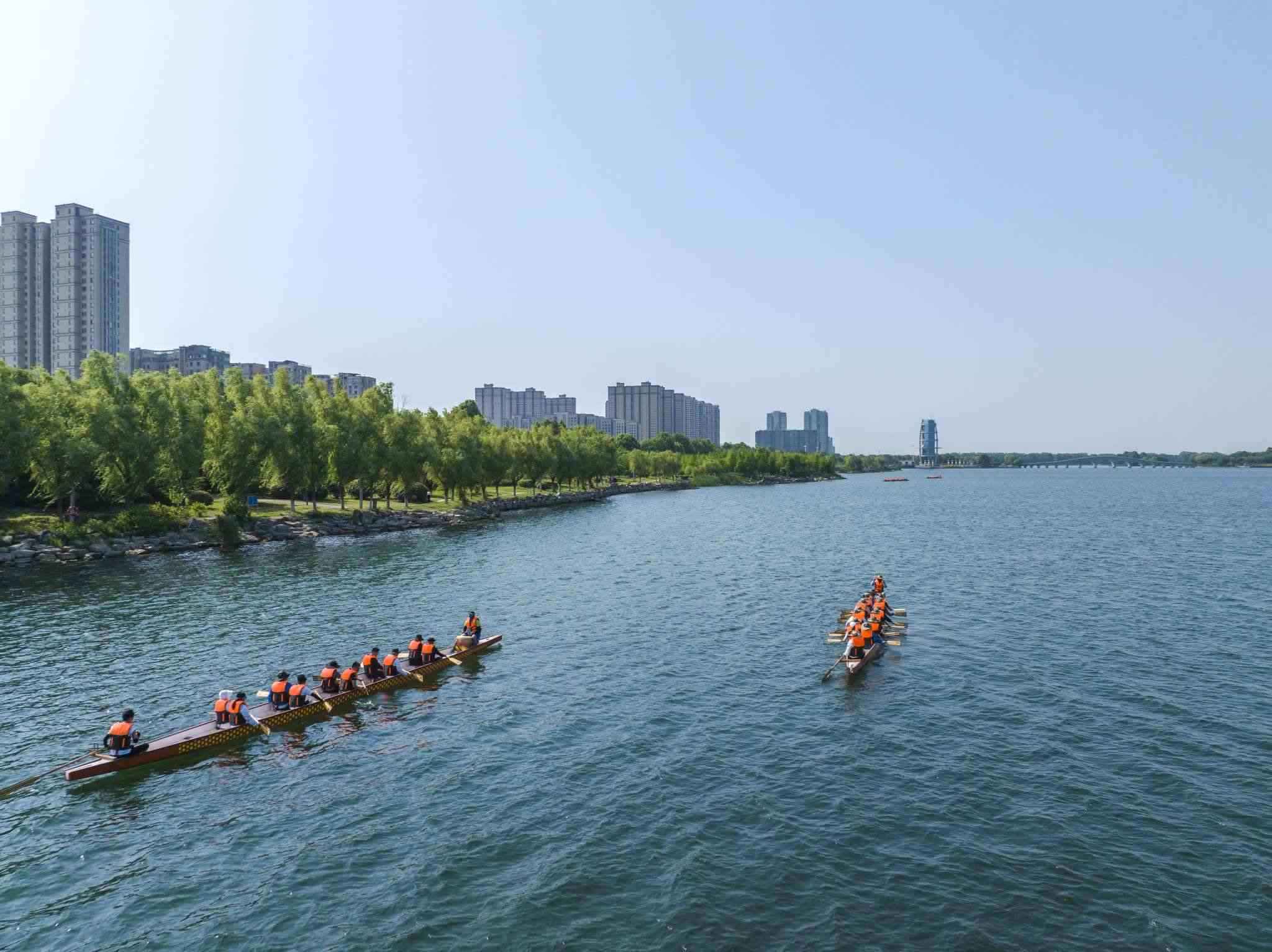 2023年6月8日,江蘇連云港,東海縣西雙湖風(fēng)景區(qū),多支龍舟隊在西雙湖水域進行訓(xùn)練,積極備戰(zhàn)端午龍舟賽。視覺中國