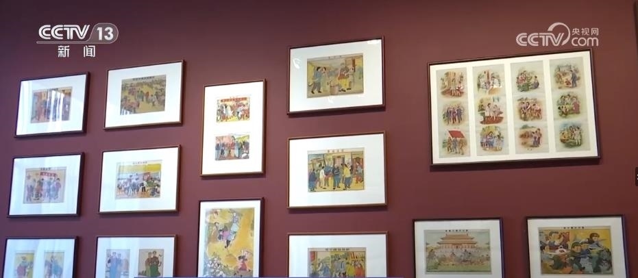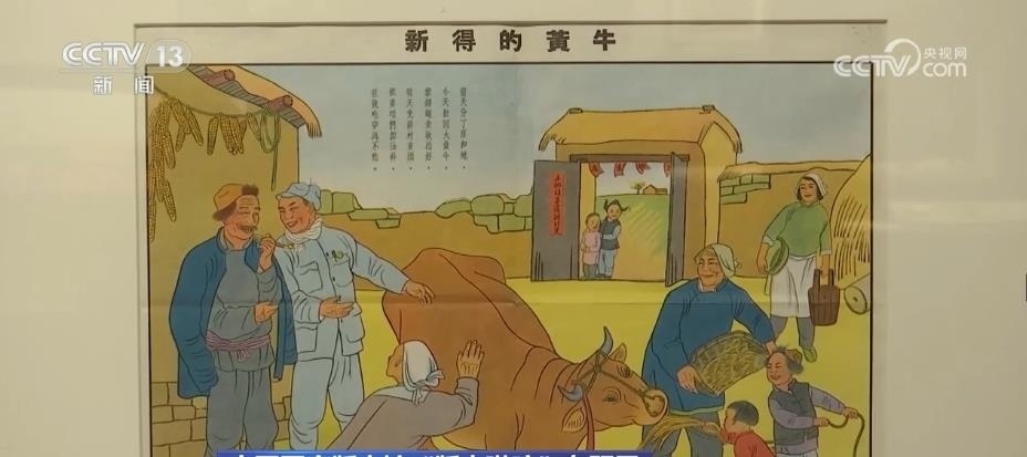 跟隨著講解員,再往前走,國(guó)家版本館的特色館藏——年畫、連環(huán)畫和宣傳畫出現(xiàn)在眼前。這面墻上和展柜集中展出了47幅新中國(guó)成立初期的新年畫。畫家李可染在1950年創(chuàng)作的《新得的黃?!返茸髌罚宫F(xiàn)出老百姓感受到新中國(guó)新生活的幸福和美好。