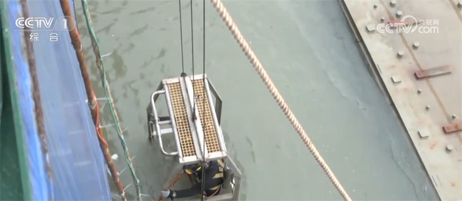 6月9日凌晨5時左右,準備潛水檢查作業(yè)的4名潛水員分別從船頭船尾下水,檢查即將安裝的最后一個管節(jié)兩端是否存在異物,并在水下安裝最終接頭測控設(shè)備。