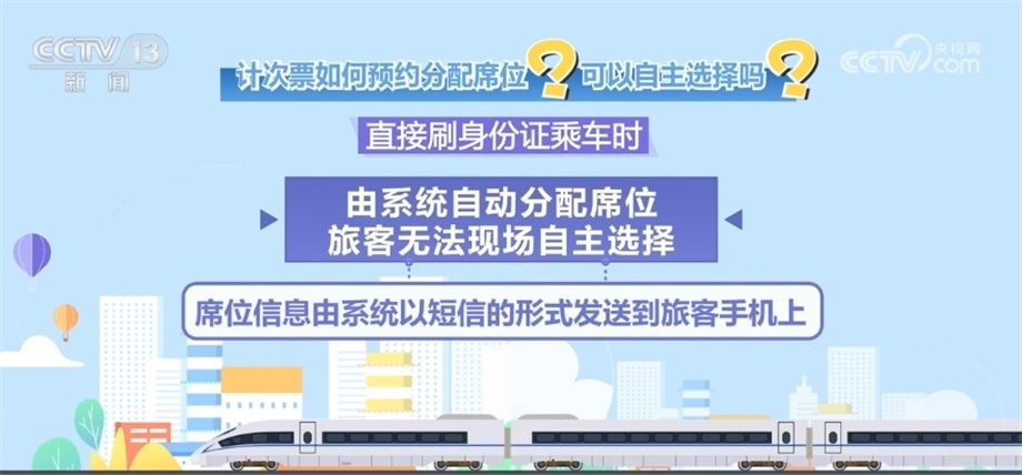 旅客提前預(yù)約時(shí),可以根據(jù)車票銷售情況,自主選擇席位;直接刷身份證乘車時(shí),由系統(tǒng)自動(dòng)分配席位,旅客無(wú)法現(xiàn)場(chǎng)自主選擇。席位信息由系統(tǒng)以短信的形式發(fā)送到旅客手機(jī)上。