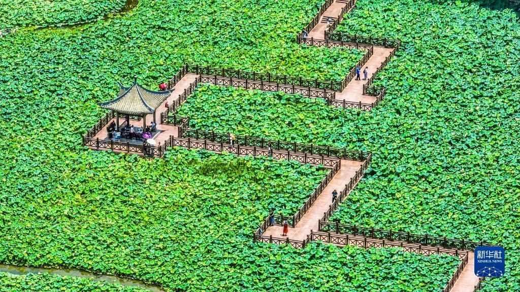 6月10日,游人在南寧市南湖之濱荷花池參觀游覽(無人機(jī)照片)。