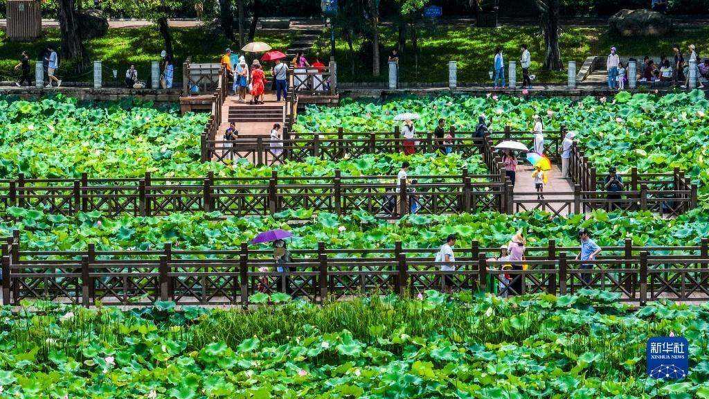 盛夏時(shí)節(jié),廣西南寧市南湖之濱的荷花漸次綻放,吸引游客前來觀賞。