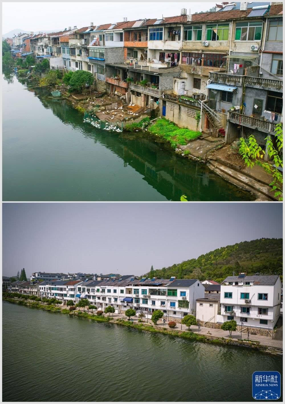 拼版照片:上圖為浙江諸暨市暨南街道街亭村開化江畔的民居(2013年11月13日攝);下圖為村容村貌提升后暨南街道街亭村開化江畔民居新貌(無人機照片,2023年4月12日攝)。新華社記者 江漢 攝