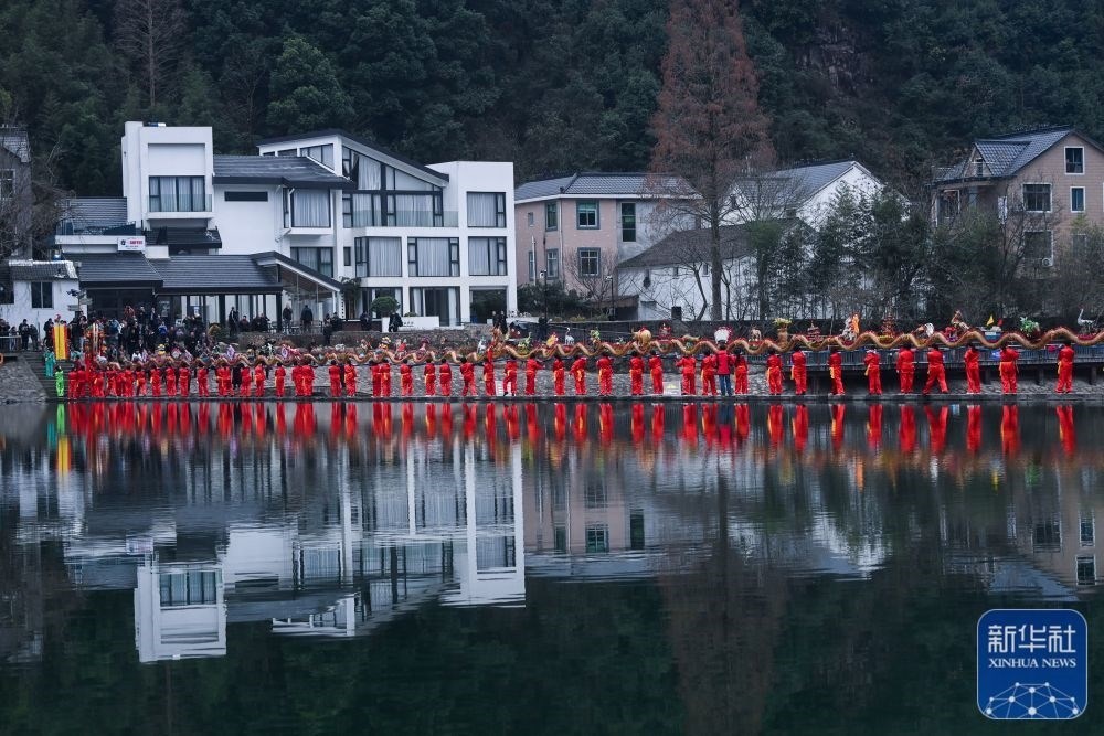 浙江杭州市富陽區(qū)湖源鄉(xiāng)窈口村女子板龍隊在進行板凳龍舞龍表演(2月1日攝)。湖源鄉(xiāng)是個群山環(huán)抱、青山綠水、生態(tài)秀美的山區(qū)鄉(xiāng)鎮(zhèn),近年來,湖源緊抓機遇,圍繞“樂水湖源、龍鱗+”發(fā)展目標,立足山水特色,錨定發(fā)展綠色經(jīng)濟,打造獨具特色的鄉(xiāng)村旅游品牌。新華社記者 徐昱 攝
