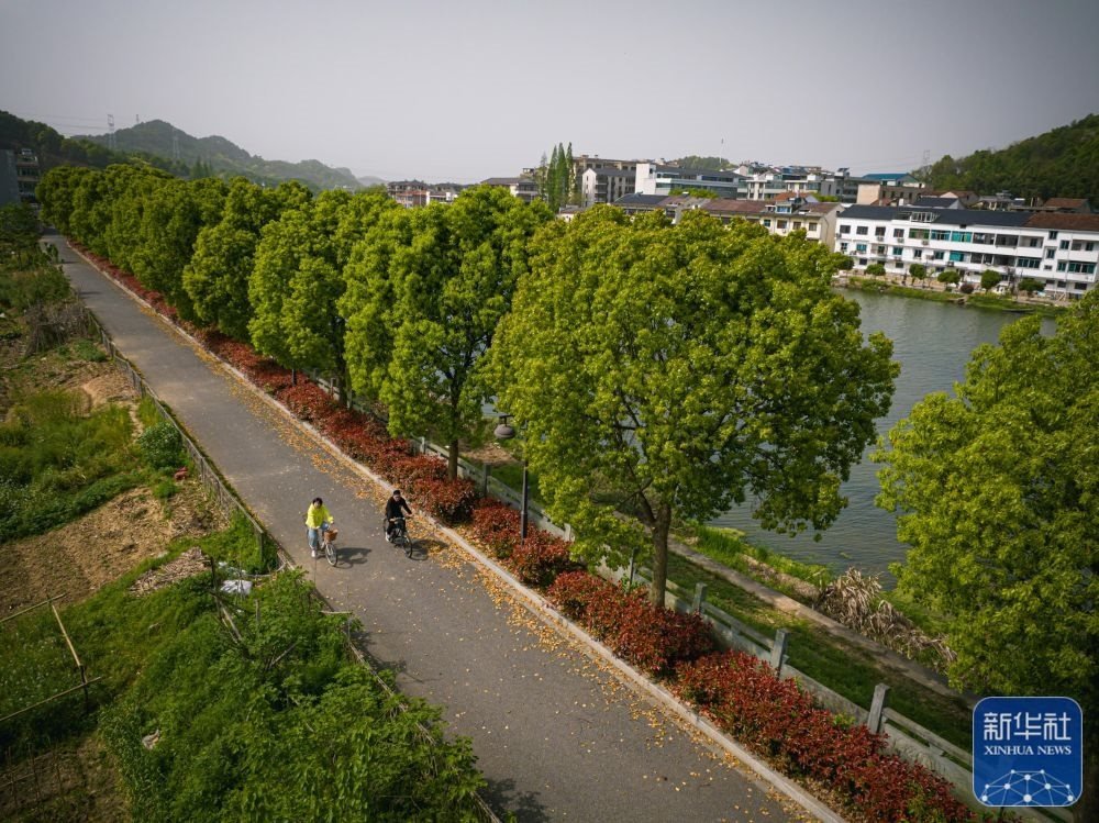 村民在浙江諸暨市暨南街道街亭村開化江畔的綠道上騎行(4月12日攝,無人機照片)。新華社記者 江漢 攝