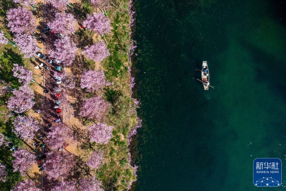 在浙江金華市浦江縣浦陽江同樂段,工作人員乘船在打撈水面漂浮物(3月14日攝,無人機照片)。當?shù)赝ㄟ^生態(tài)治理、河湖清淤、景觀改造、種植水生植物等綜合整治措施,造就浦陽江畔春有櫻花落英、秋有杉葉火紅的四季美景,滿足群眾賞景及親水需求。浦陽江也成功創(chuàng)建為“浙江省美麗河湖”。新華社記者 徐昱 攝