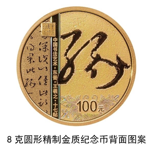 8克圓形金質(zhì)紀(jì)念幣背面圖案為東晉王羲之書《十七帖》局部文字及“緣”字樣與裝飾紋樣、“中國書法藝術(shù)”篆刻鈐印等組合設(shè)計,并刊“中國書法藝術(shù)·東晉·王羲之·十七帖”字樣及面額。
