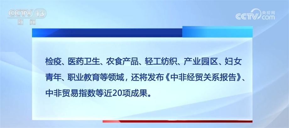會(huì)期內(nèi)將舉辦開幕式暨中非經(jīng)貿(mào)合作論壇,9場由國家部委和機(jī)構(gòu)主辦的高端活動(dòng)、7場經(jīng)貿(mào)對接、3場專題研討和13場地方專場活動(dòng),涵蓋綠色基建、海關(guān)檢疫、醫(yī)藥衛(wèi)生、農(nóng)食產(chǎn)品、輕工紡織、產(chǎn)業(yè)園區(qū)、婦女青年、職業(yè)教育等領(lǐng)域,還將發(fā)布《中非經(jīng)貿(mào)關(guān)系報(bào)告》、中非貿(mào)易指數(shù)等近20項(xiàng)成果。