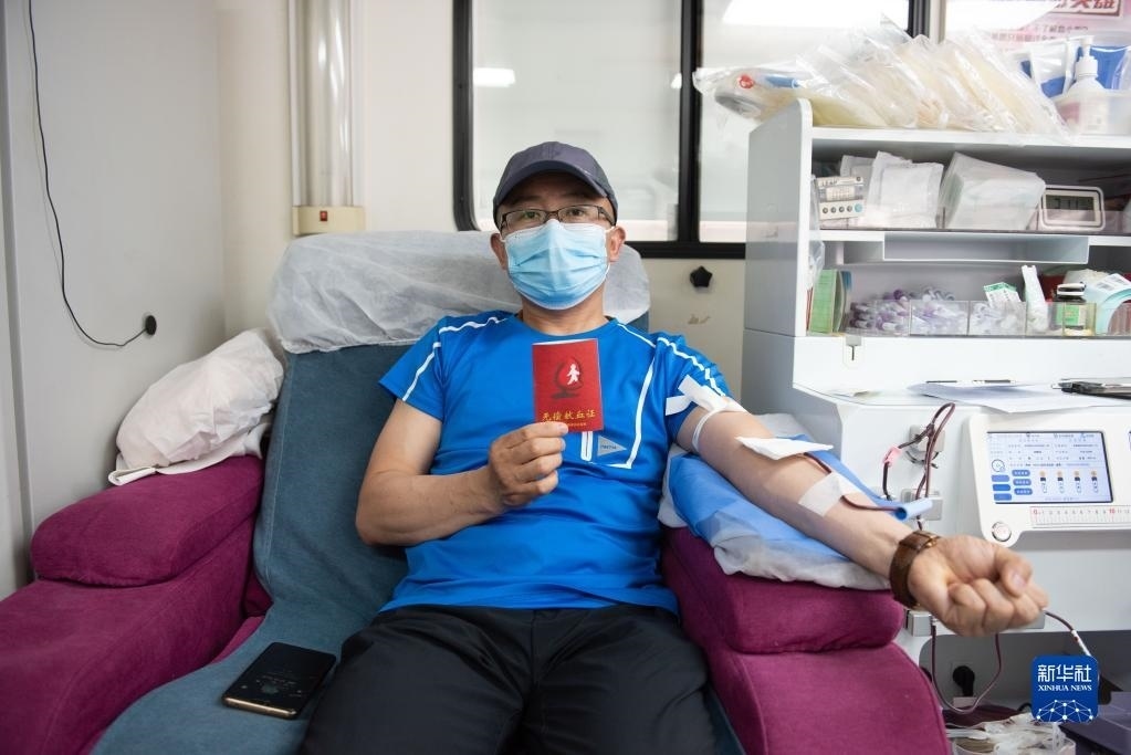 6月14日,山東省青州市志愿者在街頭一處獻血屋參與無償獻血。   新華社發(fā)(王繼林攝)